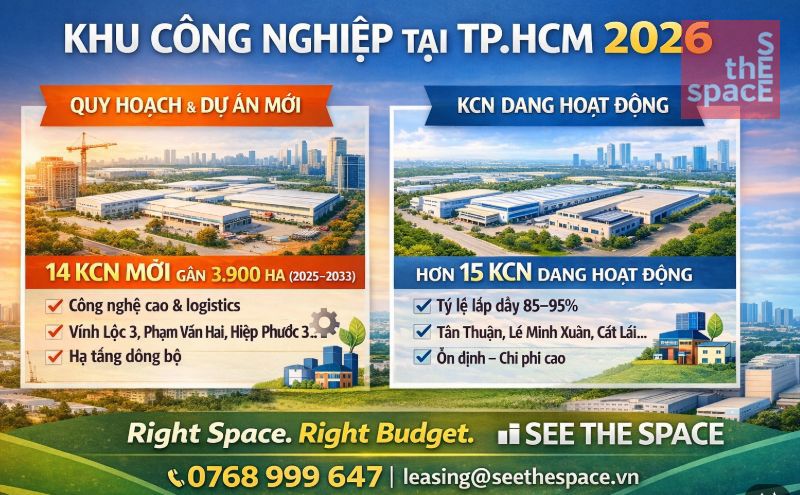 Theo định hướng quy hoạch giai đoạn 2025–2033, TP.HCM dự kiến phát triển thêm 14 khu công nghiệp mới với tổng quy mô gần 3.900 ha, tập trung tại các khu vực còn quỹ đất như Bình Chánh, Củ Chi, Hóc Môn, Nhà Bè.