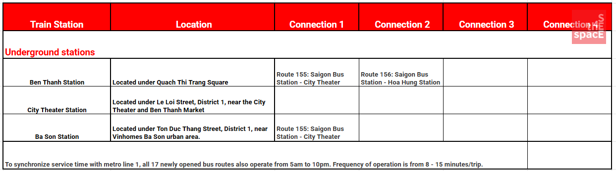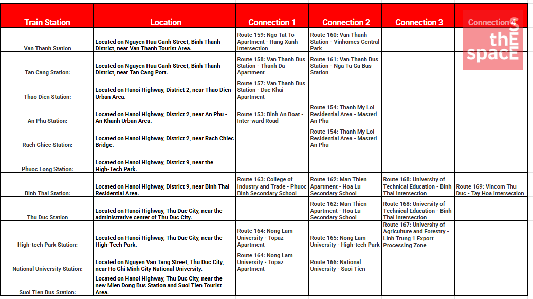 Ben Thanh Station => City Theater Station => Van Thanh Park Station => Tan Cang Station => Thao Dien Station => An Phu Station => Rach Chiec Station => Phuoc Long Station => Binh Thai Station => Thu Duc Station => High-Tech Park Station => National University Station => Suoi Tien Bus Station.