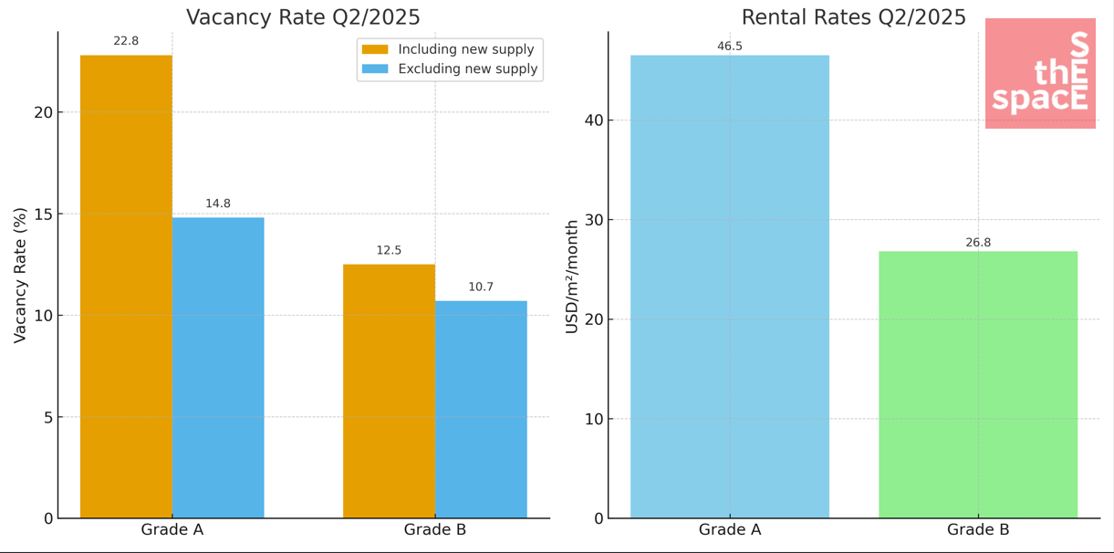 - Vacancy: Grade A: HCMC ~19%, Hà Nội ~26%; Grade B ~18–23%. Các nguồn cung mới tạo áp lực ngắn hạn nhưng cũng mở ra cơ hội chiến lược giá/ưu đãi.